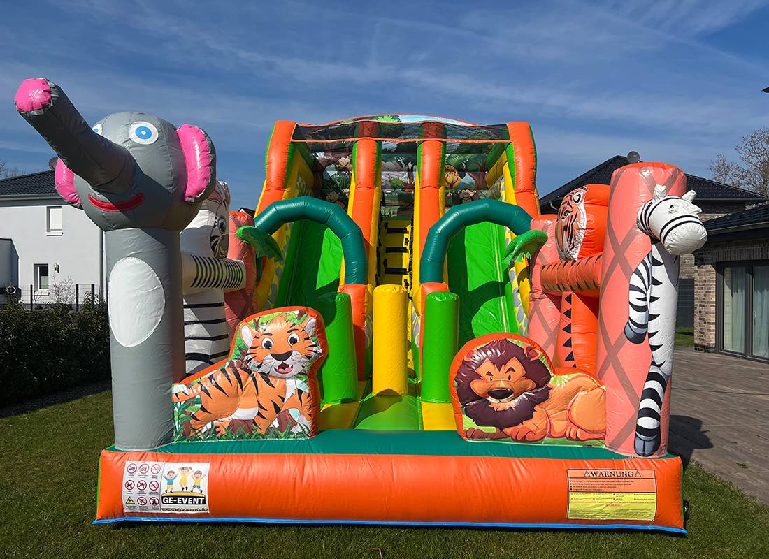 Tauche ein in unsere bunte Tierwelt – ob Tiger, Affe & Co., hier wartet ein unvergessliches Erlebnis auf die Kinder! Mit einer XXL-Rutsche und einer Höhe von 5 Metern ist der Spaßfaktor garantiert. Spieleelemente sorgen für noch mehr Action – und das Beste: Ein strahlendes Kinderlächeln ist inklusive!